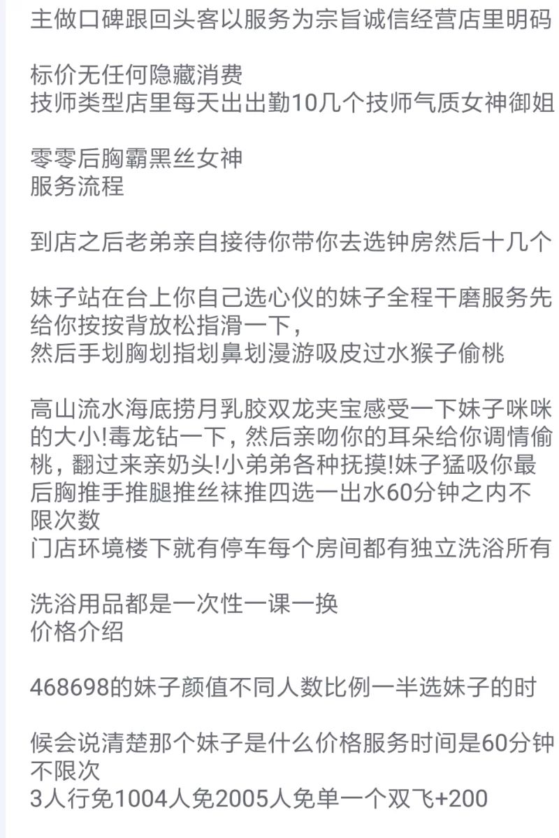 信息分类:足浴发廊 地区:甘肃省-兰州 信息来源:别人推荐 年龄:18~35 颜值身材:去了自己挑 服务项目:探花,双飞,制服,乳交 价格:800 环境设备: 详细地址:本段信息已隐藏,请先登陆。点击登陆 , 或者 点击注册 联系方式(微信):本段信息已隐藏,请先登陆。点击登陆 , 或者 点击注册 详细介绍: 介绍在图片上 足浴发廊