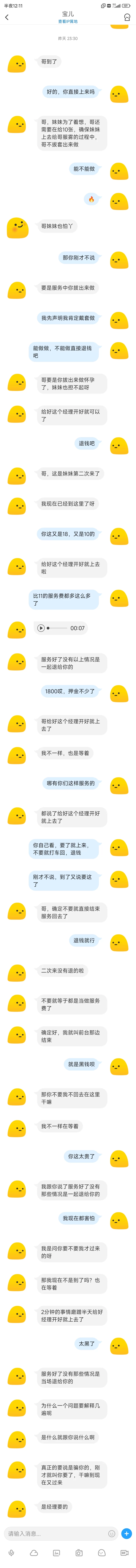 来黄山旅游,想着玩一下,打算第二天去宏村玩,现在看看附近有没有,问到一个有外卖的,第二天到了,晚上想叫过来了,当时因为问的时候那几个都说要交300押金才能来,我想着以为是这里都这样,也就交了,就从这个第一次开始一发不可收拾,我想不能这300打水漂啊,就一直给到了1100的服务费,然后通知妹子来了(来没来我也不知道)来了后,跟我说要交1800的保证不拍视频费当押金,当时我就感觉不对,我说我人都没见着又是1100加1800的,我直接下楼去找他人,她说规定不能见,发了个共享位置,我当时也是精虫上脑,shabi的给了,给我跟我说他们老板打电话说今天查的让回去,问我要了个收款码,说退我钱,我当时还sb呵呵的以为正能退,到晚上11点多了,给我发信息说现在又可以了,(其实当时已经回过味来了,感觉被骗了,但现在钱都给了,就当被骗了,但现在又发信息说可以了,就让他来吧,钱都付了,退不退还两说呢)结果来了说要再交1000保证戴套做,我直接去nmd。这事也看出来了人真不能精虫上脑啊,唉!